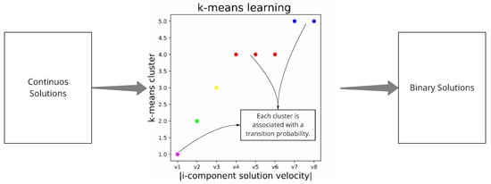 The machine learning binarization operator (MLBO) is responsible for the binarization process. This receives as input the list of solutions obtained from the previous iteration, the metaheuristic (), in this case CS, the best solution obtained, so far, and the transition probability for each cluster, . To this list , in line 4, the is applied, in this case it corresponds to CS. From the result of applying to , the absolute value of velocities, , is obtained. These velocities correspond to the transition vector obtained by applying MH to the list of solutions. The set of all velocities is clustered in line 5, using k-means (getKmeansClustering), in this particular case K = 5.