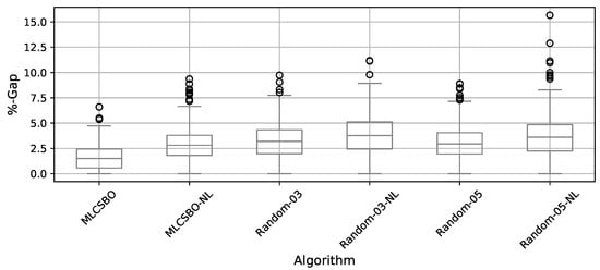 In Figure 3 and Table 4, the %-Gap, defined in Equation (8), with respect to the best known value is compared of the different variants developed in this experiment. The comparison is made through box plots. In Figure, it is observed that MLCSBO has a more robust behavior than the rest, since it obtains better values and smaller dispersions than the other variants. On the other hand, the variants that obtain the worst performance correspond to those that have the random binarization operator and do not use the local search operator.