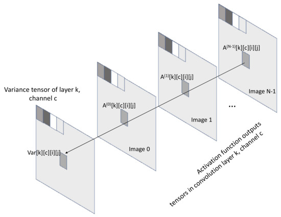 For every convolution layer k, we define a variance tensor V[k], where each element V[k][c][i][j] in the variance tensor is defined as