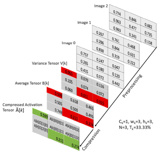 A simple example that demonstrates the VELCRO algorithm is illustrated in Figure 2, which shows the activation output tensor in convolution layer k for a preprocessing dataset of N = 3 images. The dimensions of the activation tensor are ck = 1, wk = 3, and hk = 3. The VELCRO preprocessing stage performs inference on the preprocessing dataset to create a variance tensor V[k] and an arithmetic average tensor B[k]. The hyperparameter threshold value for layer k is defined in this example as Tk = 0.33, which means that the three elements in the activation function output tensor with the lowest variance (highlighted in red) are replaced with their arithmetic average. The remaining elements remain unchanged. The outcome of the VELCRO compression stage is given by the compressed activation-function output tensor , where the computation of three elements (highlighted in green) are replaced by the arithmetic averages.