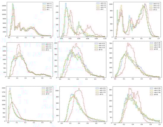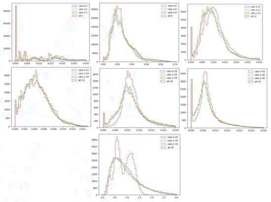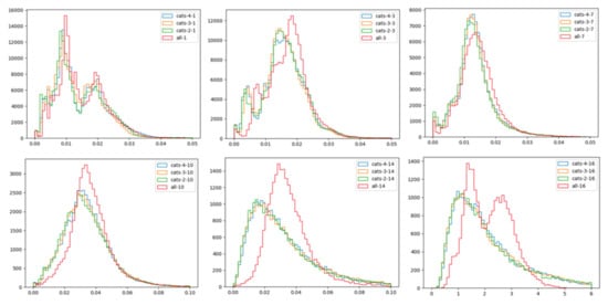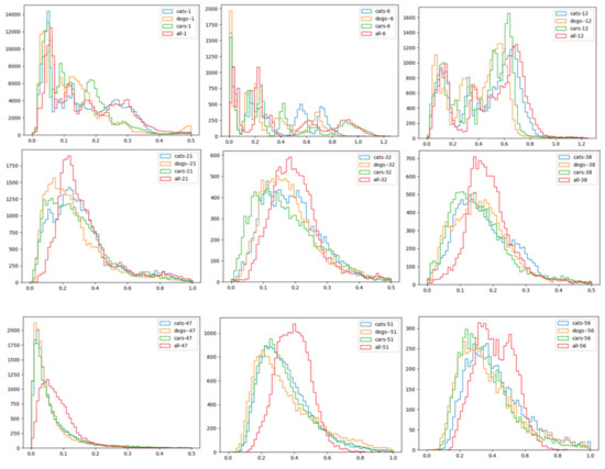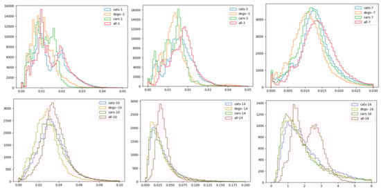 The distribution of the variance tensor elements in each layer (skipping the first layer) is a measure to quantify the proximity of the activation-function output. Figure 3 shows the distribution of the variance tensor elements for the selected activation function outputs in the convolution layers 1, 3, 7, 10, and 14 in ResNet-18. The distribution is shown for the groups of classes Cats-2, Cats-3, and Cats-4, which include two, three, and four classes of cats from the dataset, respectively. The group “all” contains a mixture of all ILSVRC-2012 dataset classes and represents the case when the CNN model is used for general tasks. When the CNN model is used for specialized tasks (Cats-1, -2, and -3), the distribution of the variance tensor elements clearly shifts toward zero with respect to the distribution when the model is used for general tasks (all), which indicates that the CNN model produces values of closer proximity (i.e., a higher degree of value locality) for specialized tasks. Another important outcome made apparent in Figure 3 is that the three groups of specialized tasks behave similarly regardless of the number of classes. The distribution of variance tensor elements in all ReseNet-18 layers is presented in Figure A1 (Appendix A) and behaves similarly to the distribution presented herein.