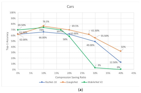 As part of our experimental analysis, we examine the compression-saving ratio of the VELCRO algorithm on three groups of specialized tasks: cats, cars, and dogs (see Table 1). Only a very small subset (<2%) of images from the preprocessing dataset has been used for the preprocessing stage of the algorithm, while the remaining images have used for the validation of the compressed model. This approach is essential in order to perform an unbiased evaluation of the model performance and preserved the generalization property of the model. Figure 9a–c present the top-1 prediction accuracy versus the compression-saving ratio for cars, dogs, and cats, respectively. The experimental analysis is applied to the ResNet-18, GoogLeNet, and MobileNet V2 CNN models. For each compression-saving ratio, we examine different thresholds by running trial-and-error and choose those that produce the highest top-1 accuracy. Table A1, Table A2 and Table A3 in Appendix B summarize the tuples of threshold values. Table 2 summarizes the maximum compression-saving ratio for each group of specialized tasks and each CNN model that produces the same accuracy as the original uncompressed model.