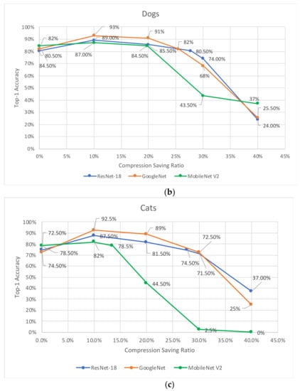 Accuracy for ResNet-18, GoogLeNet, and MobileNet V2 versus compression-saving ratio for specialized tasks: (a) Cars, (b) Dogs, and (c) Cats.