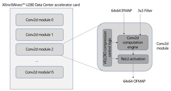 In the last part of our experimental analysis, we demonstrate the computational optimization and energy savings of VELCRO through hardware implementation on the Xilinx® Alveo™ U280 Data Center accelerator card [63]. Our hardware implementation, which is illustrated in Figure 10, consists of 16 instance modules where each is comprised of a two-dimensional convolution layer with a 64 × 64 input feature map (IFMAP), 3 × 3 filter, and a ReLU activation function. In addition, each module also includes a compression control logic which skips the compressed computations and replaces them with their corresponding arithmetic averages. Our hardware implementation was designed in Verilog and implemented using the Xilinx® VivadoTM [64] design suite.