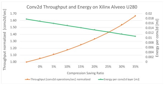 Figure 11 presents the (normalized) throughput and energy consumption of a single module instance, denoted as conv2d, which consists of the hardware implementation of a two-dimensional convolution layer and ReLU activation. As expected, the computational throughput of the conv2d layer, which is measured as the number of conv2d operations per second, exhibits a growth rate proportional to , where C is the compression saving ratio). In addition, it can be observed that the energy consumption related to the computation of a single conv2d layer decays linearly with the compression saving ratio. Thereby, for the compression saving results presented in Table 2, VELCRO can achieve 13.5–30% energy consumption savings while maintaining the same accuracy of the uncompressed model.