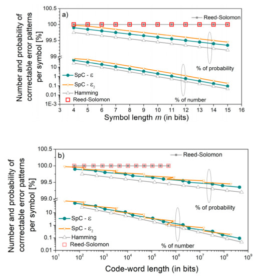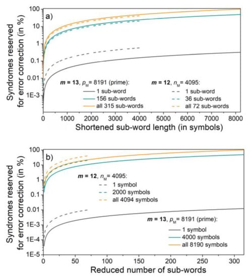 Shortening or omitting the sub-words reduces the number of syndrome values that correspond to the correctable errors, offering the possibility for error detection. This is another issue important for the application proposed in the following section. This reduction is shown in Figure 3, for two SpCs, one corresponding to Mersenne number (m = 12), and the other to Mersenne prime (m = 13). In Figure 3a, the sub-word lengths are shortened, keeping the number of sub-words as the parameter. In Figure 3b, the number of sub-words is reduced, keeping the length as the parameter. The percentage of syndromes that indicate correctable error patterns reaches 100% for Mersenne primes only.