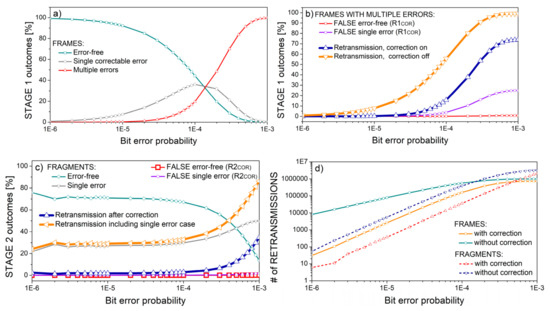 The code-word of splitting code is partitioned in sub-words that correspond to the splitting set S (Figure 1). This partitioning is suitable for mapping the individual packets into sub-words to form an aggregated frame—code-words with joint control symbols and joint headers. The byproducts of the coding procedure for each particular sub-word form auxiliary splitting control symbols that can be stored and transmitted if necessary. Thus, formed sub-code-words can also correct single-bit errors, except when defined using Mersenne primes when they correct single-symbol errors. Based on this feature, we proposed a hybrid incremental ARQ procedure as an application of SpC code. The procedure comprises three stages, with several implementation scenarios, based on turning the error correction on and off (Figure 6). In the first stage, a frame is transmitted, in a second, auxiliary control symbols are transmitted, and in the third, the sub-words (fragments) with detected errors are re-transmitted. Figure 7, Figure 8 and Figure 9 show the frame and fragment event distribution for m = 8 symbols. The results are presented as a percentage of all transmitted frames (Figure 7a,b,d and Figure 8), and as a percentage of all fragments from frames with multiple errors (Figure 7c,d and Figure 9). The figures show that the retransmission rate considerably decreases if the error correction is turned on (Figure 7b–d), but at the cost of increased residual frame and fragment rate. Residual errors are partitioned into falsely perceived error-free cases that persist if error correction is turned off, and into falsely perceived single-bit error cases, which are inherent in error-correcting scenarios. Both cases are equivalent and constant considering the fragments (Figure 7c), but the percentage of false single error frames increases with bit error probability.