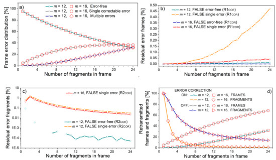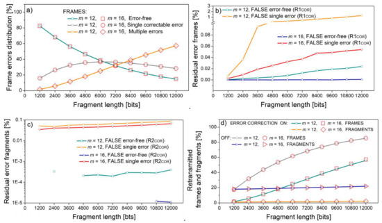 Figure 10 and Figure 11 present the results for m = 12 and m = 16. These symbol lengths are chosen as they correspond to 150% and 200% of a classical eight-bit byte. In both figures, the abscissa shows the frame length in increasing order: in Figure 10, due to the increase in the fragment length, and in Figure 11, due to the increase in the number of fragments. For this reason, the graphs showing the percentage of residual error frames in Figure 10b and Figure 11b, and the percentage of residual error fragments in Figure 10c and Figure 11c follow a similar trend both for frames and fragments.