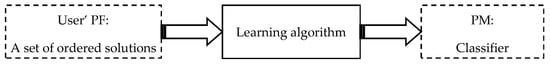 Considering the three characteristics of a flexible PM in MV-IMCDM, this paper designs a PM based on self-learning, that is, by using the PM as a classifier. The classifier has a free form, and a set of ordered solutions obtained by the user’s PF can be used as a data set. Under a certain machine learning algorithm, the classifier is generated completely based on a data set to realize a self-adaptive update. The PM based on self-learning is shown in Figure 2.