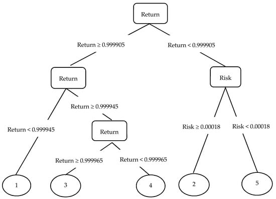 Decision tree (DT) [61] is a sequence classifier, which consists of some simple logic tests. Each test compares an attribute with a real value, and each path from the root node to the leaf node represents a classification rule. Figure 3 shows a classification rule derived from a decision tree. For the MV model, each test compares an objective function (return or risk) with a real value of the solution, and each leaf node represents the class label (preference level) of the solution that conforms to a classification rule. Because the classification rule of a decision tree is similar to human reasoning processes, the classified result is straightforward to understand. It is helpful to further users’ understanding of the problem, to make users’ PF more confident, and to accelerate the convergence of the interactive decision-making process.