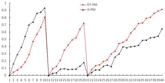 In order to further investigate the adaptive capacity of the two preference models to the change of user preferences, we obtain their Acc values at each interaction in the decision-making process, as shown in Figure 4. In the interaction interval [1, 10], because the user’s PF is expressed by a polynomial function, G-PM shows better performance, which is consistent with the conclusion in Table 1. In the interaction intervals [11, 20] and [21, 40], DT-PM shows better performances because user’s PF is represented by a non-polynomial function (exponential function and logarithmic function), which confirms the conclusions in Table 2 and Table 3. It can also be seen from Figure 4 that when user preferences change (at the 11th and 21st interactions), the Acc values of both preference models almost drop to zero. This is because the user has a shifted preference structure simulated by an exponential function at the 11th interaction and a logarithmic function at the 21st interaction, respectively, which is fundamentally different from that simulated by a polynomial function at the 10th interaction and an exponential function at the 20th interaction, respectively. Both preference models, DT-PM and G-PM, are unable to accommodate for such a drastic preference change. It should be acknowledged that at the 1st interaction, the user’s PF is only used to initiate a preference model for which the Acc value is set to zero. Through the successive interactions, the Acc values of both preference models gradually increase. It is obvious that between two adjacent interactions, the Acc values of DT-PM recover to a higher level, which illustrates the impressive ability of DT-PM to capture a user’s arbitrary preference change.