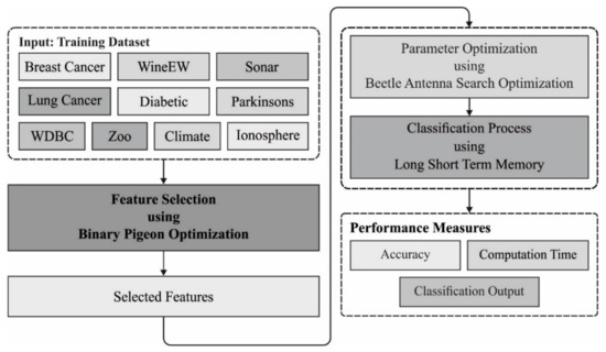This section performs a detailed review of existing FS-based Big Data classification models available in the literature. In Alweshah et al.’s study [10], a new optimization method, the monarch butterfly optimization (MBO) model, was executed by a wrapper FS technique, which employs K-nearest neighbor (KNN) classifiers. Research has been conducted on eighteen standard datasets. El-Hasnony et al. [11] presented a novel binary variant of the wrapper FS–grey wolf optimization (GWO) and particle swarm optimization (PSO). The KNN classifiers using Euclidean separation matric were employed for finding an optimum solution. A chaotic tent map helped in evading the approach from locked to optimal local problems. The sigmoid function was used to convert the search space from continual vectors to a binary one to be appropriate for the problems of the FS model, and cross-validation K-fold was employed for overcoming the over-fitting problem. BenSaid and Alimi [12] presented an online FS model that resolves these problems. The presented optimal feature selection (OFS) method, named MOANOFS, examines the current developments of online ML methods and a conflict resolution method (automatic negotiation) to improve the classification performance of the ultrahigh-dimension database.