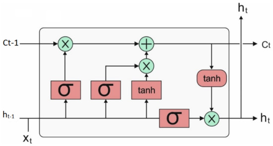 where , , , and represent the input gate, forget gate, output gate, and cell activation vector, respectively, with similar sizes to vector determining the hidden values; represents a nonlinear function; represents the input to the memory cell layer at time ; , , , , , , , , , , and indicate the weight matrices, with the subscripts demonstrating the from–to relationship indicates the input–input gate matrix, denotes the hidden-input gate matrix, etc.); , and signify bias vectors. Layer representation was neglected for clarity network with LSTM cells, have achieved an outstanding performance when compared to regular recurrent units in speech detection, in which they provide an advanced result in phoneme detection [23]. Figure 2 depicts the architecture of the LSTM model.