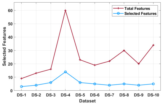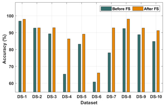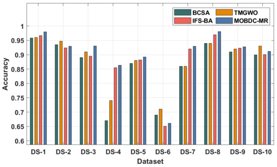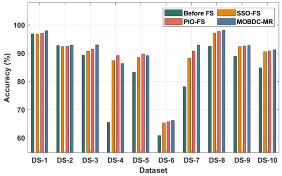 The results of the classification analysis of the MOBDC-MR technique on all the applied datasets are given in Table 2 and Figure 3 and Figure 4. The results depict that the MOBDC-MR technique attained maximum accuracy after the FS process and chose only a minimum number of features on the applied datasets. The accuracy analysis was carried out using the MOBDC-MR technique with and without the FS process. The results demonstrate that the MOBDC-MR technique accomplished proficient results with higher accuracy after the FS process. For instance, the MOBDC-MR technique resulted effective in classification after the FS process by obtaining an accuracy of 97.98%, 92.88%, 92.98%, 86.25%, 89.15%, 66.11%, 92.86%, 98.05%, 92.75%, and 91.18% on the applied datasets 1–10 respectively. Similarly, the MOBDC-MR technique chose a minimal number of 3, 4, 6, 14, 6, 5, 4, 5, 4, and 5 features on the applied datasets 1–10, respectively.