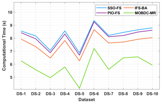 In addition, with dataset-5, a lower CT of 4.14 s was required by the MOBDC-MR technique, whereas the SSO-FS, PIO-FS, and IFS-BA approaches needed increased CTs of 6.87 s, 6.69 s, and 6.25 s, respectively. Eventually, with dataset-10, a lower CT of 5.92 s was required by the MOBDC-MR algorithm, whereas the SSO-FS, PIO-FS, and IFS-BA techniques required superior CTs of 8.79 s, 8.61 s, and 8.04 s, respectively.