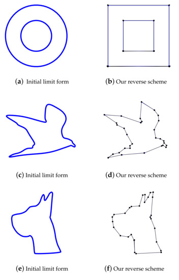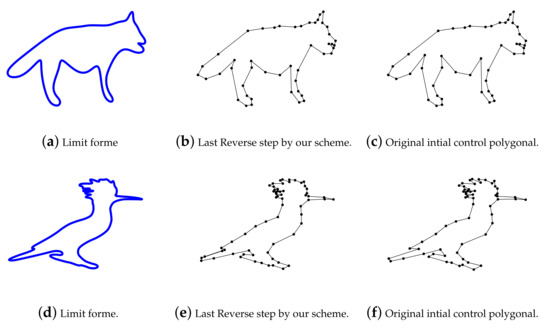 Figure 6 presents the powerful generalized reverse subdivision scheme of order 4 to reproduce a different initial control polygonal. The tension parameter for the dog is where the one chosen for the head is .