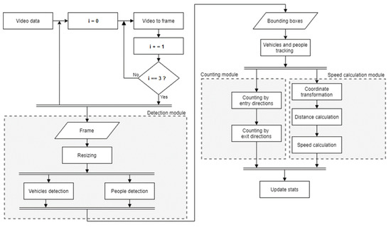To collect traffic and pedestrian flow data, we developed an autonomous tracking system based on neural networks [33]. This system detects the location, trajectory, number, and movement speed of road users. The neural network architecture in our system consists of indicator detection, counting, and calculation modules. The algorithm for obtaining the data on the movement trajectory of vehicles and pedestrians is shown in Figure 1.