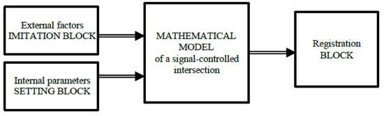 We propose completing an analysis of the traffic capacity at one signal-controlled object depending on a number of both deterministic (intersection geometry, road quality, etc.) and random influencing factors (pedestrian flow, traffic intensity, weather conditions). The conceptual block diagram of the computer simulation model for this task can be represented as follows (Figure 4).