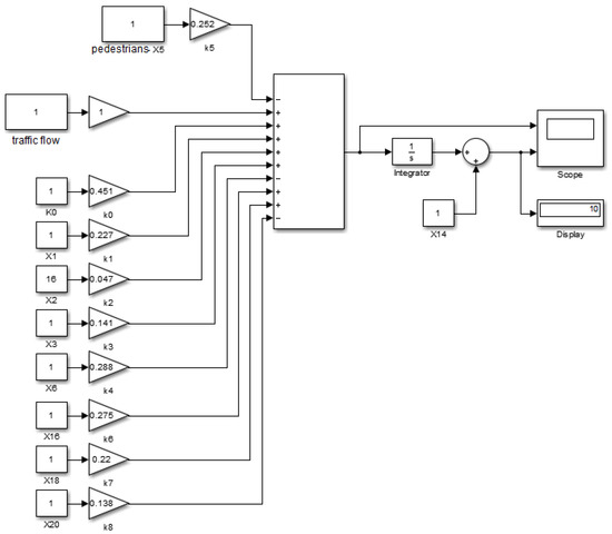 In the centre of the diagram, the adder block implements a static regression model according to Equation (2); pedestrians (x5) and vehicle flow simulate external factors, and the right side of the model integrally accumulates the vehicle flow under the initial conditions (x14). Numerical values characterizing one specific intersection are set as the initial data (xi).
