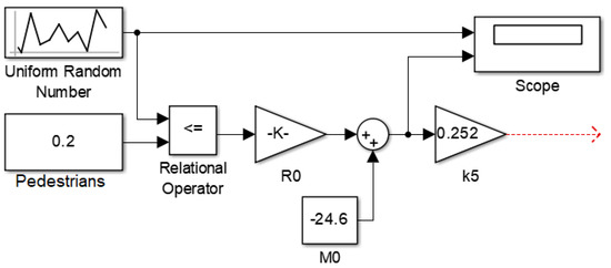 We apply a continuous-stochastic model (Q-scheme), setting the uncertainty in the pedestrian arrival flow, to closely approximate real-world conditions. To this end, we supplement the model with a block for generating a random pedestrian flow with a uniform distribution law, which provides for a preset probability value (constant x5 block). A complete model of a random pedestrian flow is shown in Figure 6.