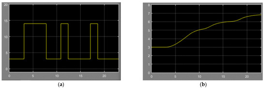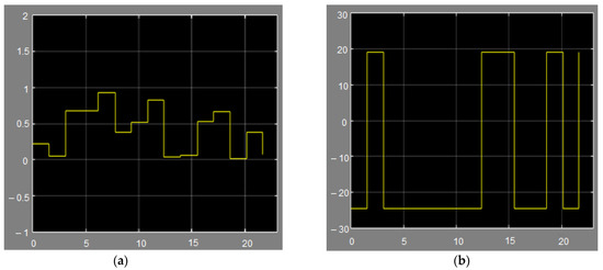 Figure 7a shows the quality of generating a random signal by the URN block linked to real pedestrian flow. Figure 7b shows a variable simulating a pedestrian flow with a probability of 0.2 (the upper level corresponds to the presence of pedestrians).