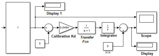 To simulate the dynamics of the vehicles passing the selected intersection, we supplement the static model with an inertial Transfer Fcn block simulating the vehicle acceleration inertia according to the first-order differential equation (aperiodic link). The final form of the dynamic model, including calibration blocks, is shown in Figure 8.