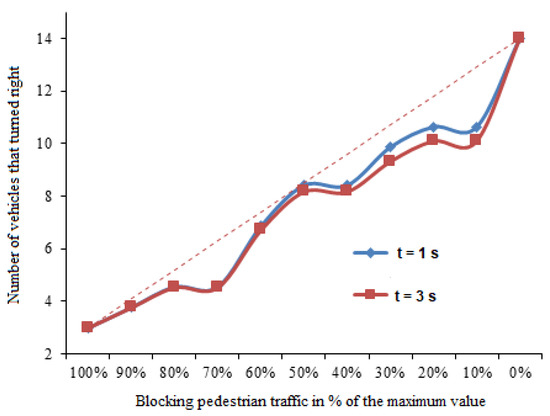 Analysis of Figure 10 shows a deviation from the linearity of the relationship between the vehicle flow and the pedestrian flow in the opposite direction. It shows two model graphs with different vehicle acceleration inertia in 1 and 3 s. Notably, these results were obtained only for one of the probable pedestrian flow situations.