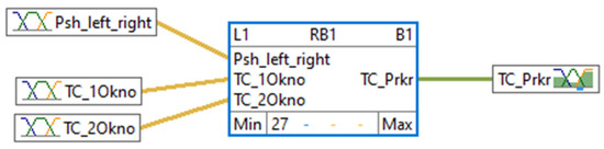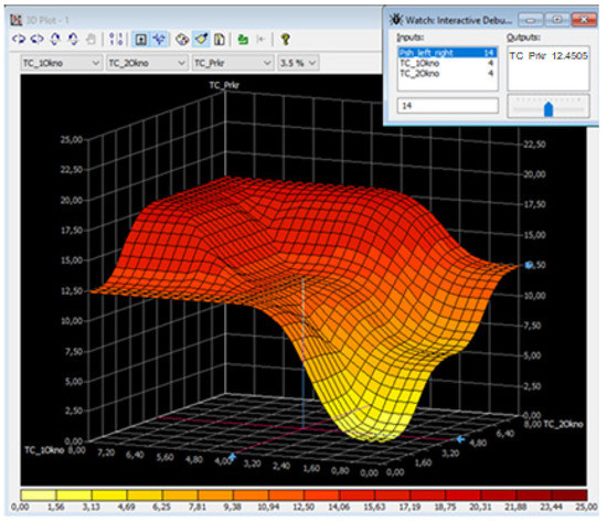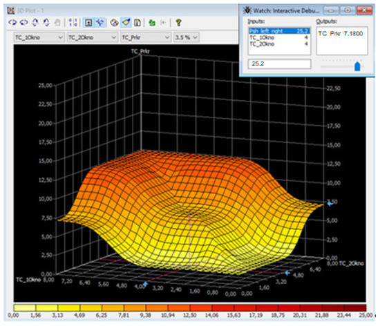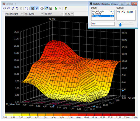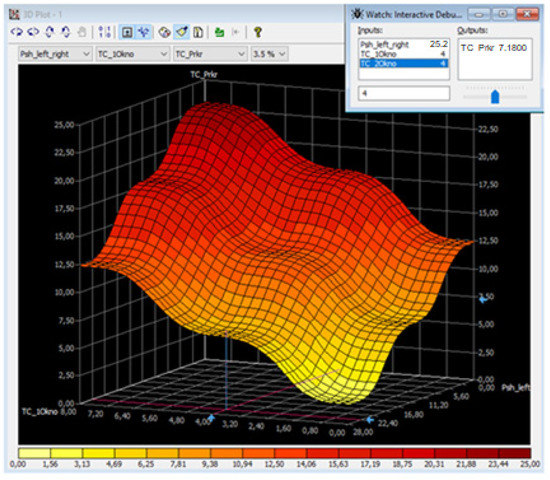 The predictive model for assessing the influence of the total pedestrian flow and its continuity on the traffic capacity of an intersection is based on the fuzzy logic method and the programme fuzzyTECH 8.77e. The basis is the static regression Model (2). The dependent variable TC_Prkr (traffic capacity of an intersection) is predicted depending on the values of the independent variables Psh_left_right (pedestrian flows x5 and x6) and its instability factors—TC_1Okno, TC_2Okno (the first and second interruptions of the pedestrian flow—x8 and x10).