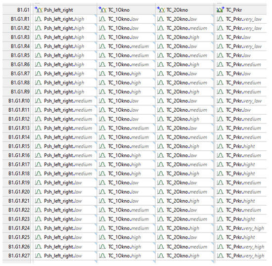 There are three terms for independent variables and five for the dependent variable. The distribution of the values by the terms of the independent variable TC_1Okno and the dependent variable TC_Prkr is shown in Figure 12a,b, respectively.