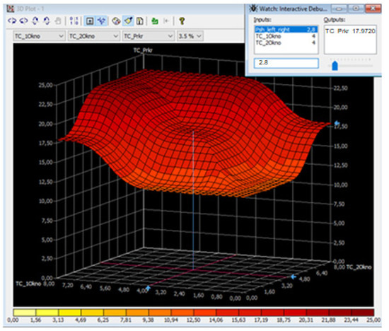 Let us consider the predictive visualization of the traffic capacity of an intersection obtained by the minimized regression model (2), taking into account the aforementioned aspects: the use of conceptually informative independent variables and Gaussian membership functions.