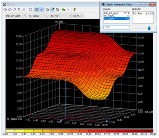 Let us look at the traffic capacity of the simulated intersection and its relation to the instability of the pedestrian flow (the first and second windows in the flow) at different intensity values of the pedestrian flow itself. Figure 14, Figure 15 and Figure 16 show the graphs and the calculation of the predictions of the dependent variable (intersection capacity, TC_Prkr) on the influence of the pedestrian flow instability (independent variables TC_1Okno, TC_2Okno) at the intensity of the blocking pedestrian flow (variable Psh_left_right) of 10%, 50%, and 90% of the maximum values.