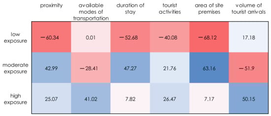 To initiate a comparison with the previous categorization, the proposed approach assumes three clusters for the -means clustering of tourist sites. Distinct characteristics for each cluster are revealed. The “low exposure” cluster includes tourist sites with small premises, closer to home, with activities that allow tourists not to stay longer. The “moderate exposure” cluster, on the other hand, characterizes tourist sites with large premises where tourists can stay longer but with minimal tourist arrivals. Finally, the “high exposure” cluster involves sites with a huge volume of tourist arrivals that would engage in a higher number of tourist activities. Tourist arrivals in this cluster are encouraged by more available modes of transportation. These characterizations of clusters advance our previously reported findings [3], where multiple criteria sorting methods set these categories merely a priori by the analysts who might have limited knowledge of the domain problem. On the other hand, the proposed -means clustering with IVIF datasets provides a practical approach by analyzing patterns within the dataset and reveals the shared characteristics of those tourist sites within the same cluster. Extracting these characteristics offers practical insights to tourists and tourism enterprises, as well as the government for policy- and decision-making. The proposed approach assigns 12 sites to the “low exposure” cluster, 15 sites to the “moderate exposure” cluster, and eight sites to the “high exposure cluster. While these assignments are idiosyncratic, meaningful insights that would associate the type of the tourist site and the cluster can be revealed to the case stakeholders and the general tourism sector.