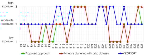 Using the similar methodological framework adopted in the assignment of tourist sites, the evaluation of restaurants according to the perceived degree of exposure of customers to COVID-19 is demonstrated as a second case study. With set similarly, the “low exposure” cluster is characterized by restaurants that are just nearby, with low consumer traffic, and customers’ stay is shorter (e.g., food orders are served fast). The “moderate exposure” cluster contains restaurants that have an average rating on all evaluation criteria. That is, their evaluation scores lie on the average of all restaurants assessed in every criterion. Lastly, the “high exposure” cluster is associated with restaurants located at a distance, with high consumer traffic and longer service times (i.e., customers staying longer). Again, these characteristics that could not be gained from multiple criteria sorting methods are the major advantage of a clustering approach. In addition, the hospitality sector and the government would benefit from these characteristics as they would serve as guidelines for the post-pandemic recovery of the sector. On the other hand, customers can associate these characteristics of restaurants to other similar restaurants that are outside the evaluation reported in this work. This practical value is crucial to the recovery of the hospitality sector amidst the pandemic, with the emergence of variants that can escape vaccines. The proposed approach yields 16 restaurants assigned to the “low exposure” cluster, 16 labeled having “moderate exposure”, and eight in the “high exposure” cluster. Exploring the characteristics of these restaurants to assess other restaurants in other local regions is an added value.
