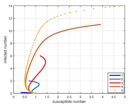 The phase portraits of I vs. S for system (1). The five trajectories correspond to different initial conditions and