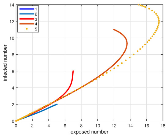 In Figure 4, we observe five solution curves by the phase portrait of I vs. S, corresponding to five initial conditions. In Figure 5, we plot the phase portrait of I vs. E and see that five solutions converge to the with five different initial conditions. In Figure 6, we have five solutions and the phase portrait of I vs. R. Therefore, it can be seen from these figures that all solutions approach the disease-free equilibrium point under the mentioned initial conditions.