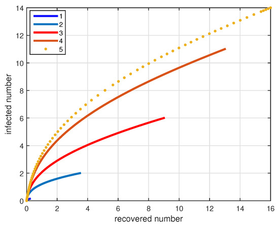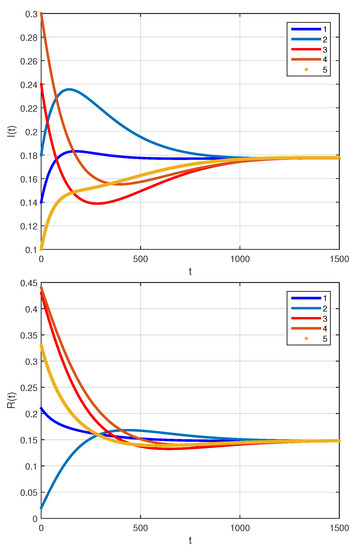 The basic reproduction number is such that and the system (1) has only the disease-free equilibrium of . We take the following five initial conditions: