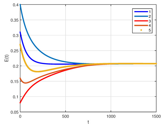 The numerical simulation of system (1) with five different initial conditions is illustrated in Figure 2 and Figure 3, where all orbits converge to .
