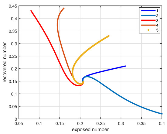 We verify that orbits converge to the . The corresponding phase portraits of R vs. S with the above different initial conditions are depicted in Figure 9, which demonstrates the globally asymptotic stability of endemic equilibrium . Further, the state portraits of R vs. E, with five different initial conditions, is depicted in Figure 10, that displays the global asymptotic stability of . In Figure 11, we plot the phase portrait of R vs. I corresponding to these initial conditions. The figures confirm that the endemic equilibrium is globally asymptotically stable, and all solutions converge to under the mentioned initial conditions.