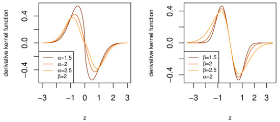 According to Figure 2, for heavier tails and lower degrees of freedom , the derivative kernel function has higher magnitudes in the tail and lower magnitudes at the body of the function. Next, we study the derivative of the GN distribution kernel from (1)