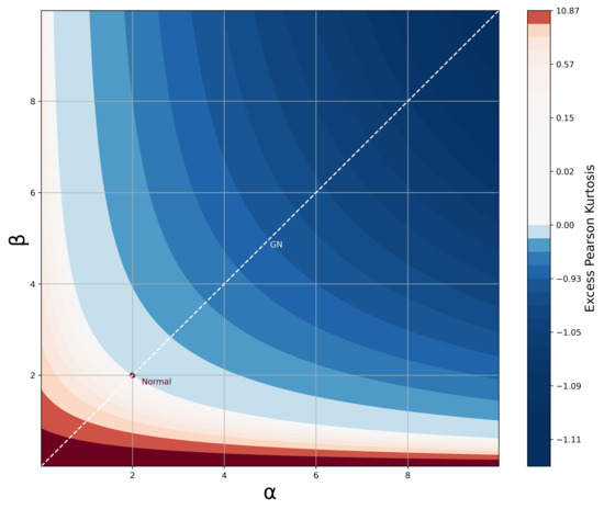 where and . Referring back to the desirable traits in Section 1, the density function, CDF, and moments of the BTGN consist of very well known special functions and satisfy the desirable trait of simple and closed-form expressions. The BTGN density function is depicted for different combinations of its parameters in Figure 4 and Figure 5. For a fixed body shape of , values of are more heavy-tailed than the GN distribution with , and more light-tailed for values of . The excess Pearson kurtosis for the BTGN, GN, and normal distribution is depicted in Figure 6, confirming the latter properties. The range of different body or tail shapes for a given level of kurtosis has been generalized to contours on the plane for the BTGN. Although different levels of kurtosis can be achieved on straight line combinations of , the body and tail shapes cannot vary.