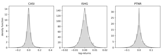 The data consist of daily log-returns for the shares of three companies listed on the NASDAQ, each in different market sectors. The companies are CASI Pharmaceuticals, Inc. (CASI), iShares S&P (ISHG), and Partner Communications Company Ltd. (PTNR). The period for the data is 4 January 2016 to 31 December 2020, available online http://finance.yahoo.com, accessed 20 September 2021. In Table 1, the summary statistics and the Jarque–Bera test statistics for normality are given for each stock. It is observed that all the series are leptokurtic, and the Jarque–Bera statistic confirms the departure from normality at a 1% significance level. The returns distributions are fitted using ML estimation, and the ghyp package in R [53] with the simplifying assumption of independence of observations. For the validation of results, we use the in-sample criterion computed on the entire sample and an extra verification with out-of-sample LL calculated on the last 20% of the data time range, which was excluded during estimation.