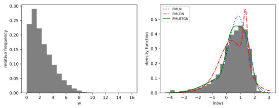 In this section, the BTGN is used in a real-world application, showing the need for flexible distributions and the benefits they have to existing fields of study. The evaluation of fit is done by computing both in-sample and out-of-sample validation metrics. The in-sample statistics are Akaike information criterion () and Bayesian information criterion (), and it is computed on the subset of data used for estimation. The out-of-sample validation is the computed a subset of data excluded from estimation. This ensures robust goodness of fit analysis and prevents the overfitting of the final models. Overall, we illustrate the wide applicability of the BTGN in a variety of applications by the use of different competitor distributions and estimation techniques in each data modeling situation. All applications are implemented using packages NumPy [42], Scipy [43], and mpmath [44] in Python. All the above is applicable unless stated otherwise.