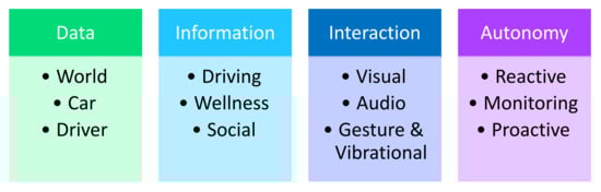 The smart driving interface components (see Figure 1) are data (further described in Section 3.1), information (further described in Section 3.2), interaction (further described in Section 3.3), and autonomy (further described in Section 3.4). We would like to emphasize the fact that the list of data presented in this article is not exhaustive, but it is merely a fraction of the types of data available, as discussed in the State-of-the-Art section. By choosing our data producers, we meant to exemplify data categories (world, car, driver), that are later processed into information categories (driving, wellness, social), how they help provide multimodal interaction (visual, audio, gesture), and how they help the system act on different levels of autonomy (reactive, monitoring, proactive).