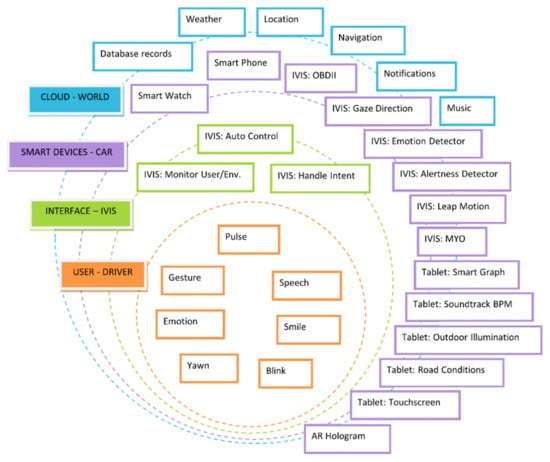 The car, as part of the intelligent environment [100], should function as an empathic agent [101], having a multimodal interface [102] making use of artificial intelligence [103], mixed reality [104], and natural interaction [105,106]. Multimodality [107] uses different channels and modes of communication. Through the visual field we may understand text, symbols, images, animations, and the system may capture gestures, recognize objects, and detect the depth of the environment. Sound and touch represent other widely used channels of communication, and the list may continue, especially for the unlimited possibility of digital systems to augment their perception through a wide variety of sensors. As for humans, there is research going on into EMG, EOG, EEG interfaces [108]. Brain interfaces [109,110] may even infer the state of the mind by analyzing brain waves and augment expression of intensions.