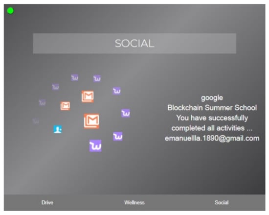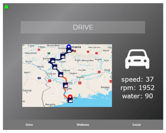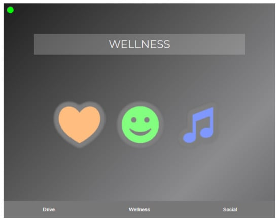 By default, in the absence of interaction from the user’s side, the system will constantly switch between the three panels every 20 s. If there is an event occurring in one of the three areas, driving, wellness, or social, then the respective panel will be displayed, along with a short message or an alert about the event.