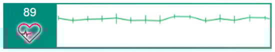 We have also designed graph plotting for the pulse (see Figure 5). The plotting function has several parameters. The first sets over what time interval we wish to show values. The seconds sets the time subunit for which we want to calculate a mean value and a variance value. If this parameter is set to 0 then the pulse is plotted for each numerical value and there is no variance. We experimented with different visualizations and called the function on different intervals such as, the pulse during last 3 h with segments representing the mean value and variance over 9 min subunits, and the pulse during the last 15 min with segments representing the mean and variance over 45 s subunits. Each segment end represents the mean value in a subunit interval. Variance coming from positive values is plotted above the graph while that produced by negative values is plotted under the graph. The numerical value is the pulse rate at the present moment.