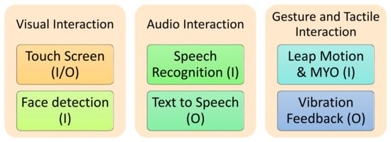 We have also experimented with natural interaction through gestures using the MYO (https://developerblog.myo.com/, accessed on 1 July 2021) device, which reads muscular contractions through a Electromyography EMG interface and infers gestures. It knows the configuration of the hand because gestures such as a stop sign or a gun shooting gesture involve different muscular subgroups. It also knows the dynamics of the gestures using its inertial measurement unit composed of a three-axis gyroscope, accelerometer and magnetometer.