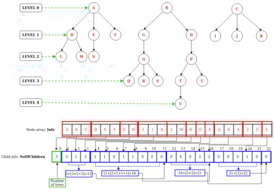 In this method, the nodes are traversed level wise as seen in Figure 2. Since NoOfChildren[0] is the number of trees and the rest of the NoOfChildren array stores the number of children for each node, the sum of all elements is one less than the length of the array. This is the broader idea for the outer loop to run, i.e., the position of the current node is less than the length of the array. We also group the levels in NoOfChildren by summing up the number of children from the previous level. For instance, in Figure 2 we have NoOfChildren [0] = 3 roots (A, B, and C). We then have a total of 3 + 2 + 3 = 8 children (DEFGHIJK) of these three root nodes. The sum of these values gives the index of the last element of the next level. The pseudo-code is Algorithm 1.