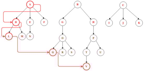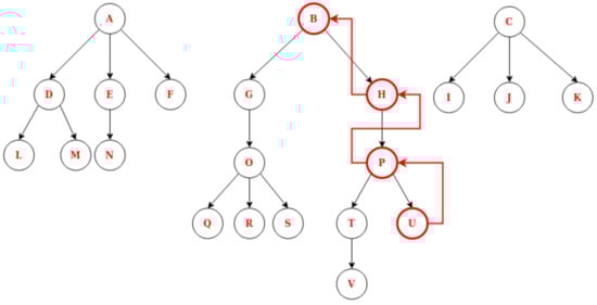 The idea here is to traverse only one component of the forest: a tree or a subtree. The information of a node is provided as the starting node to traverse through. Only the (sub)tree having that node as root will be traversed by this algorithm. Let us consider an example where all the nodes connected to ‘P’ have to be traversed, as shown in Figure 4. Referring to Equation (1), where in this case, m = P, indicates the last child of P, i.e., node V. Thus, we can traverse through the nodes as follows.