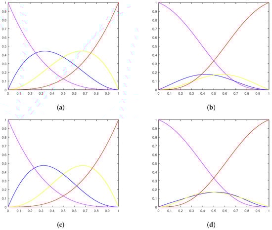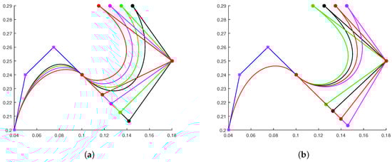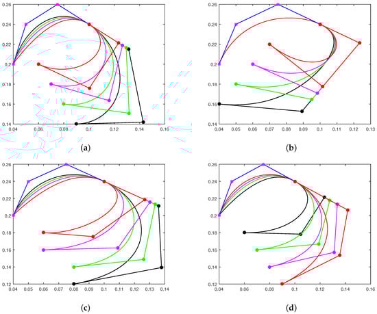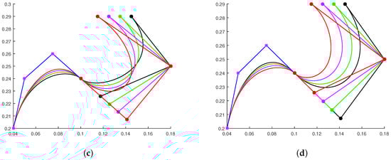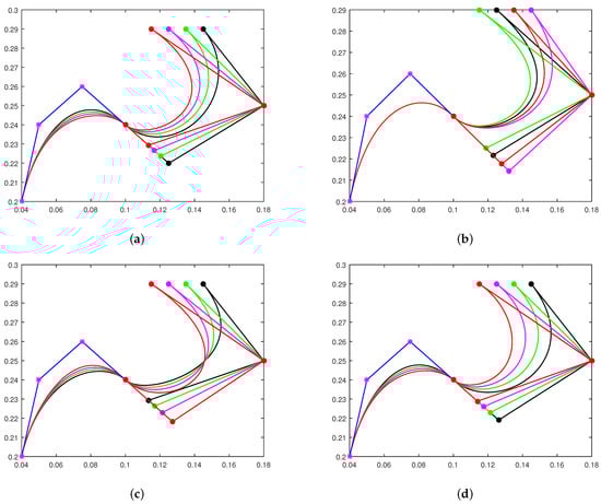 In Figure 2, control points and were selected to construct curves. Through the continuity condition, and could be obtained. The last two control points and could be freely selected according to our needs. All these multiple thin and dotted curves could be attained by the variation of shape parameters. The different values of shape parameters are mentioned underneath the figures.The shape parameters in the graph appear in the form of array. The first four groups and the last four groups correspond to the curve colors in the graph: black, green, purple, and red.